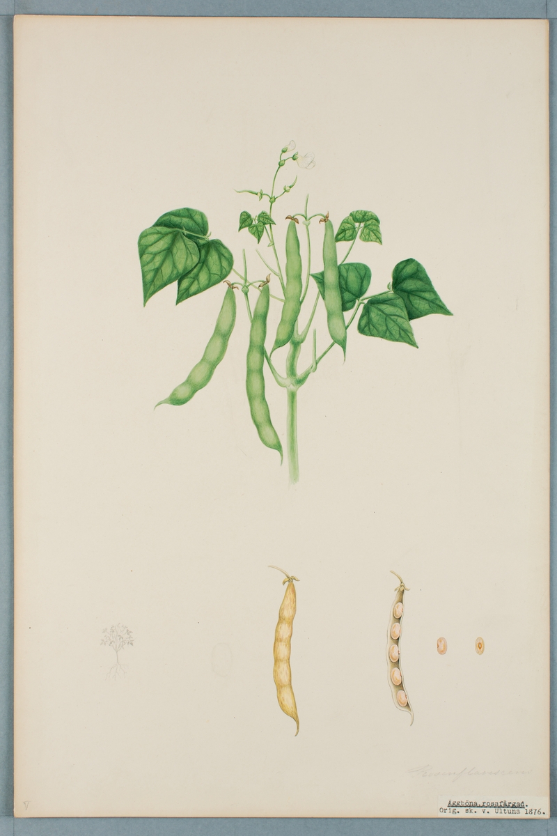 Sveriges kulturväxter. Illustration utförd av Henriette Sjöberg. Rosafärgad äggböna. Odlad Ultuna 1876. Inv. nr. C101 : 480.