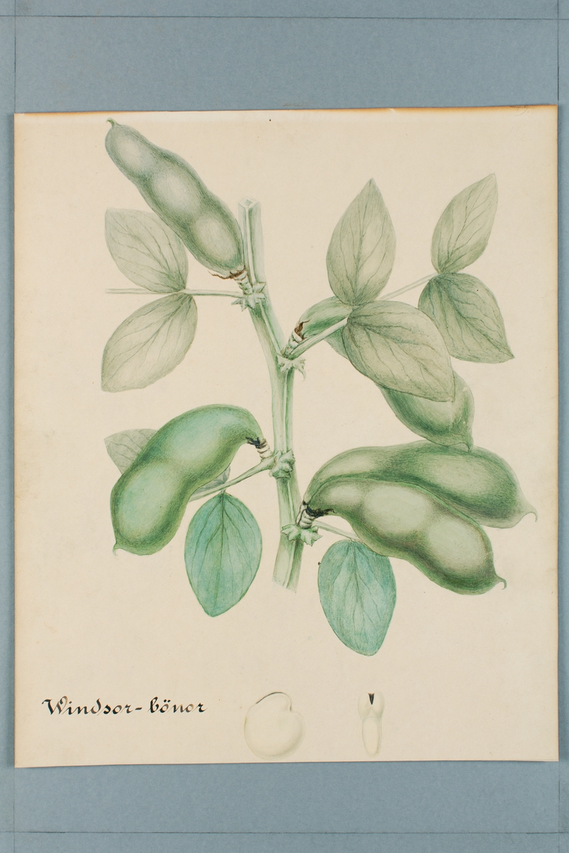 Sveriges kulturväxter. Illustration utförd av Henriette Sjöberg. Böna, Windsorböna. Odlingsplats och datering saknas.