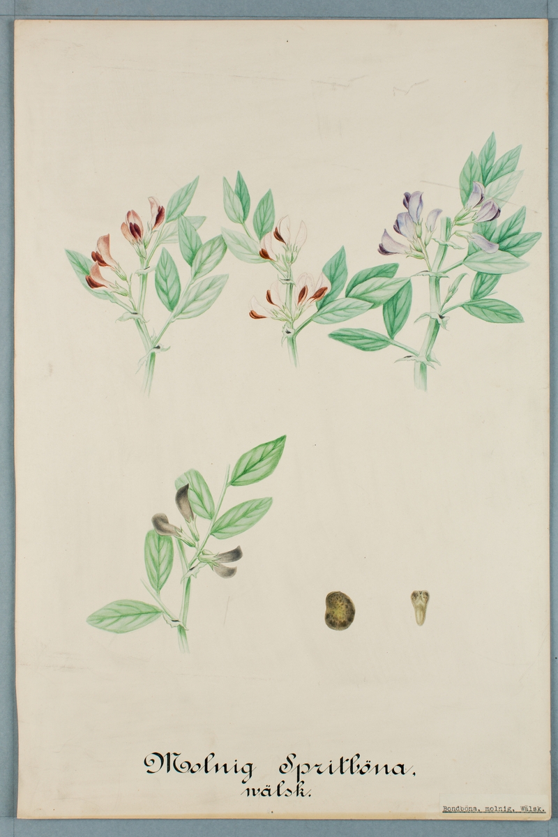 Sveriges kulturväxter. Illustration utförd av Henriette Sjöberg. Böna, Wälsk, molnig (spritböna påskrift). Odlad Ultuna, datering saknas. Inv. nr. C101 : 446.