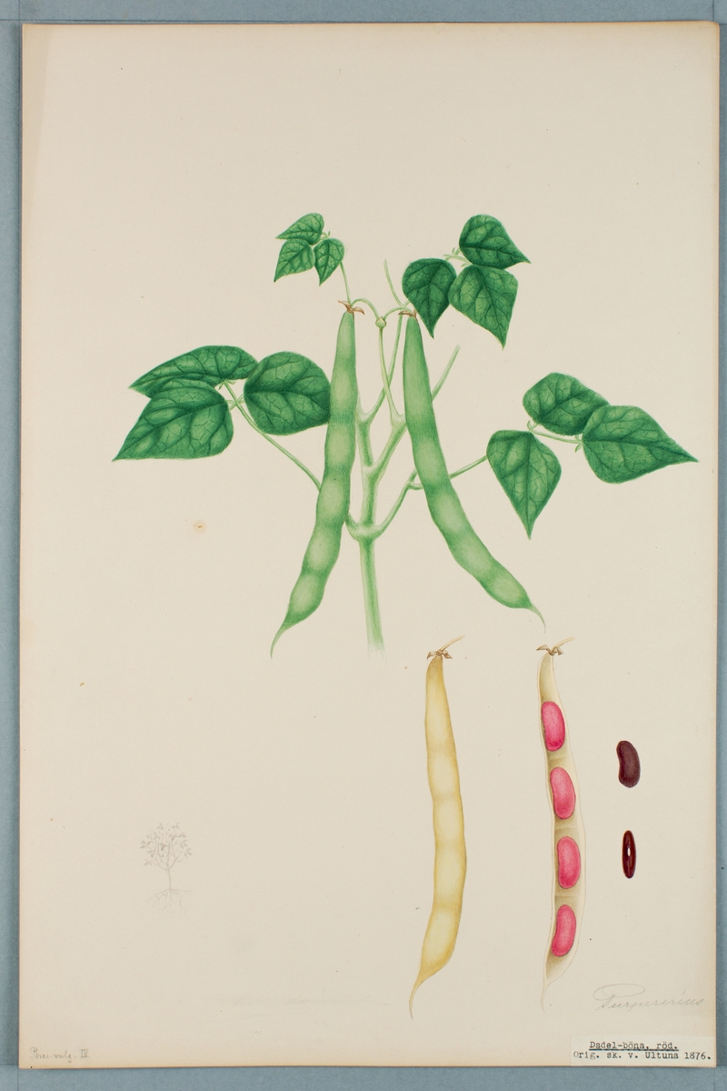 Sveriges kulturväxter. Illustration utförd av Henriette Sjöberg. Röd dadelböna. Odlad Ultuna 1876. Inv. nr. C101 : 451.