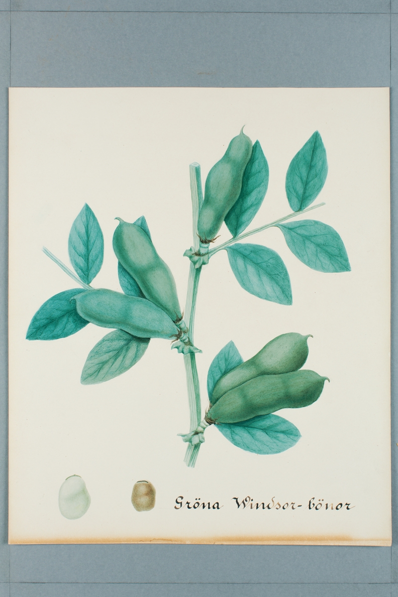 Sveriges kulturväxter. Illustration utförd av Henriette Sjöberg. Gröna Windsor-bönor (påskrift). Odlingsplats och datering saknas.