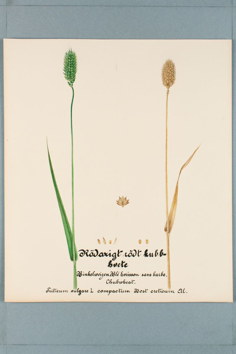 Sveriges kulturväxter. Illustration utförd av Henriette Sjöberg. Vete, rödaxigt, rött Kubbvete, Binkelweizen/Blé herrison sans barbe. Odlingsplats och datering saknas.