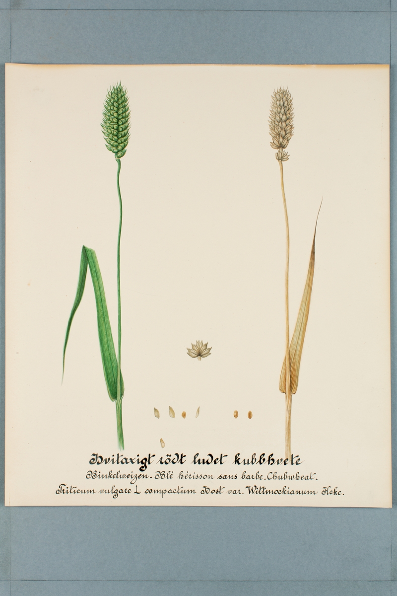Sveriges kulturväxter. Illustration utförd av Henriette Sjöberg. Vete, vitaxigt, rött, ludet Kubbvete, Binkelweizen/Blé herrison sans barbe. Odlingsplats och datering saknas.