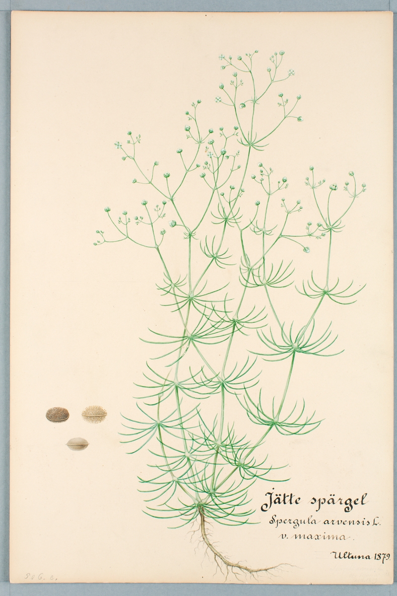 Sveriges kulturväxter. Illustration utförd av Henriette Sjöberg. Jättespergel. Odlad Ultuna 1879. Signerad "H.S. 79.".