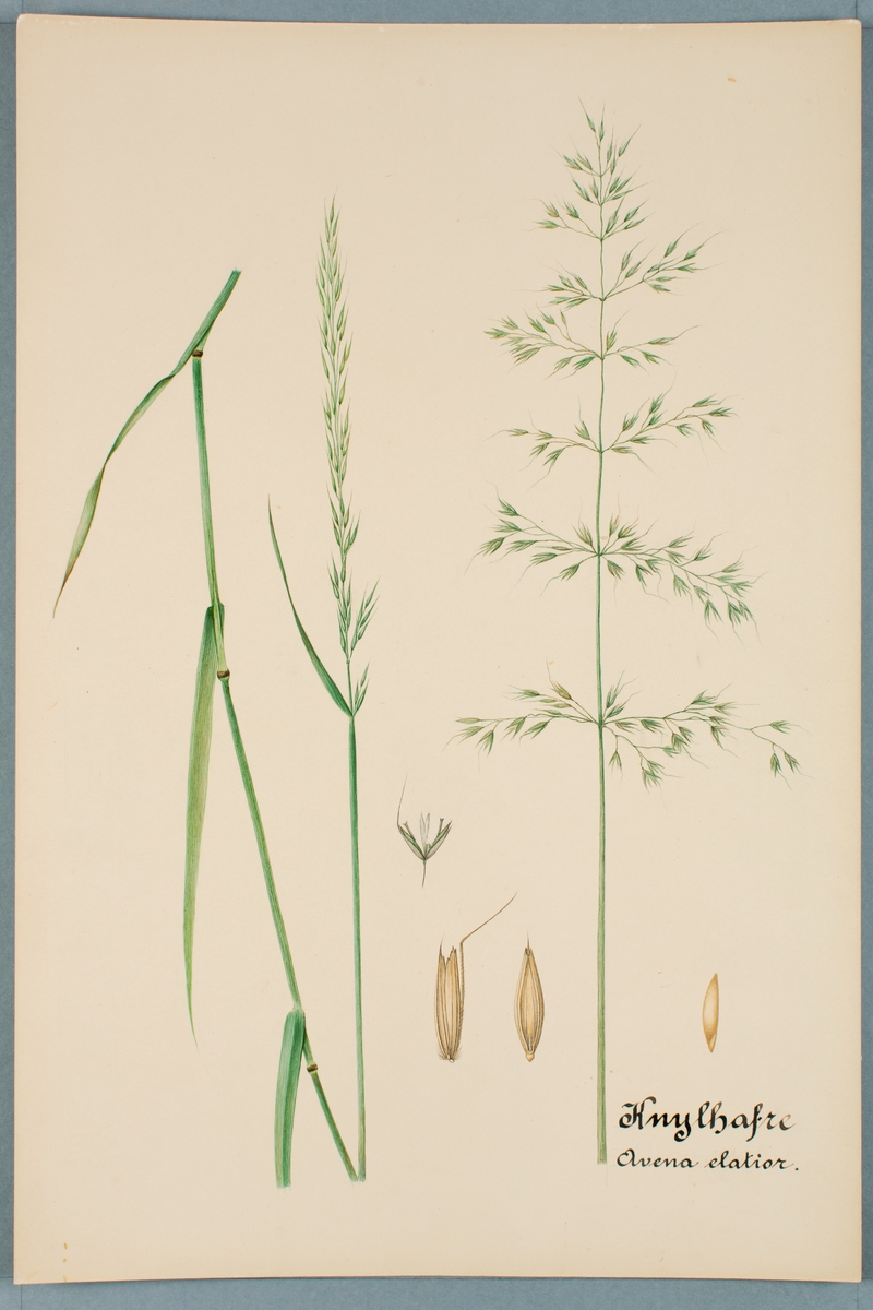 Sveriges kulturväxter. Illustration utförd av Henriette Sjöberg. Knylhavre. Odlingsplats saknas, 1896. Signerad "H.S. 1896.".