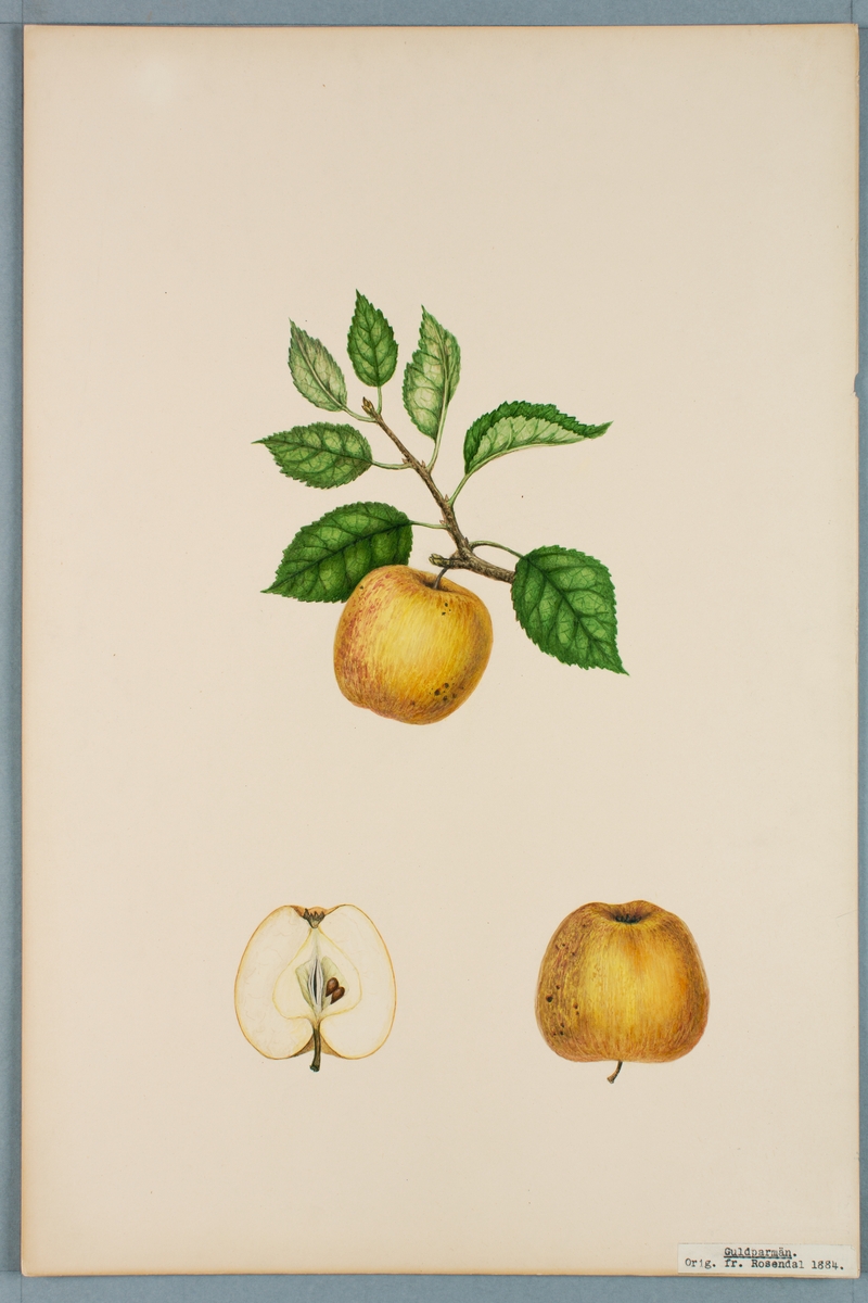 Sveriges kulturväxter. Illustration utförd av Henriette Sjöberg. Äpple, Guldparmän. Odlat Rosendal 1884. Signerad "H.S. 1884.".