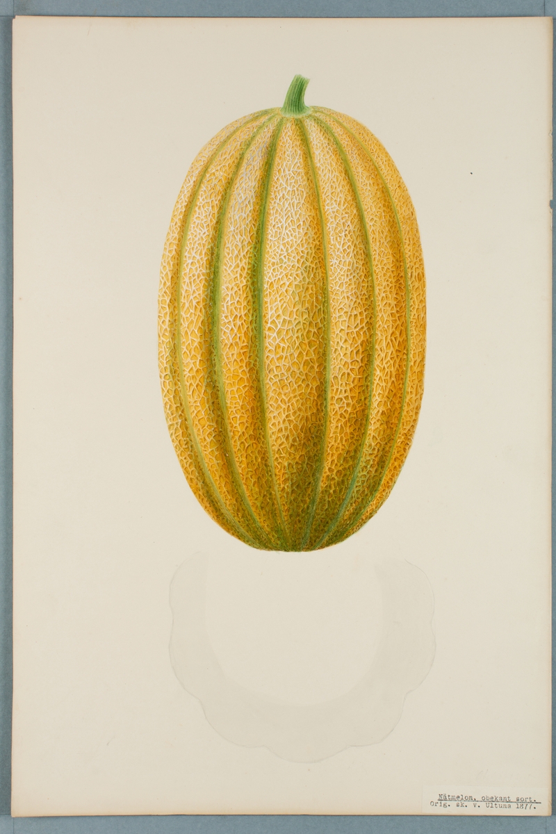 Sveriges kulturväxter. Illustration utförd av Henriette Sjöberg. Melon, nätmelon, obekant sort. Odlad Ultuna 1877. Inv. nr. C101 : 519. Påskrift på baksidan "Erhölls under det orätta namnet Gros fond gris". Jämför NMA.0098462.