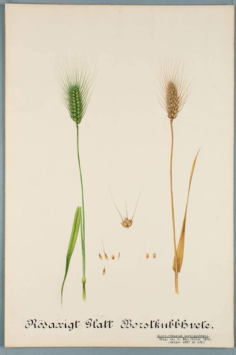 Sveriges kulturväxter. Illustration utförd av Henriette Sjöberg. Vete, Borstkubbvete, glatt, rödaxigt. Odlat Experimentalfältet 1889. Eriksson 1892, nr. 109. Inv. nr. C101 : 122. Signerad "H.S. 1889 Exp.".