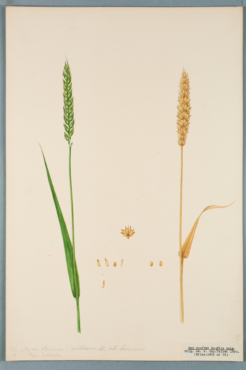 Sveriges kulturväxter. Illustration utförd av Henriette Sjöberg. Vete, Red chaff Danzik. Odlat Experimentalfältet 1890. Eriksson 1892, nr. 78. Inv. nr. C101 : 79. Signerad "HS. Exper 1890.".