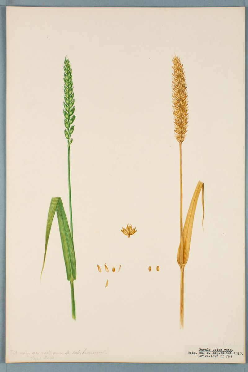 Sveriges kulturväxter. Illustration utförd av Henriette Sjöberg. Vete, Royale prize. Odlat Experimentalfältet 1890. Eriksson 1892, nr. 76. Inv. nr. C101 : 80. Signerad "HS. Exper 1890.".