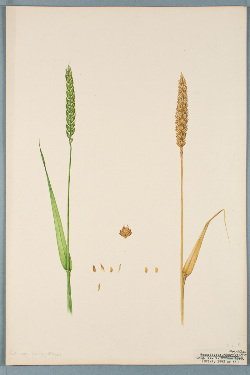 Sveriges kulturväxter. Illustration utförd av Henriette Sjöberg. Vete, Sammetsvete, rödaxigt. Odlat Experimentalfältet 1890. Eriksson 1892, nr. 83. Inv. nr. C101 : 82. Signerad "H.S. Exper 1890.".