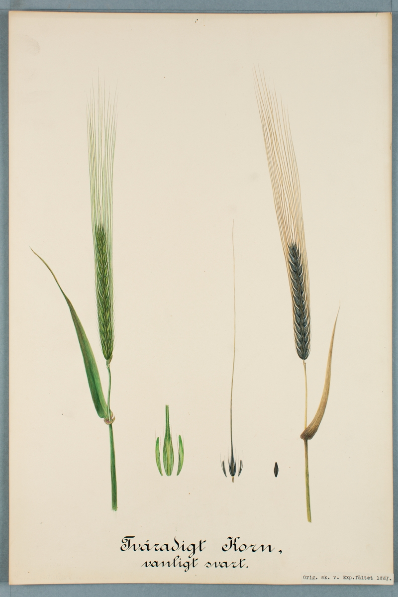 Sveriges kulturväxter. Illustration utförd av Henriette Sjöberg. Korn, tvåradigt, vanligt svart. Odlat Experimentalfältet 1887. Signerad "Henriette Sjöberg Exper fälte 1887.".