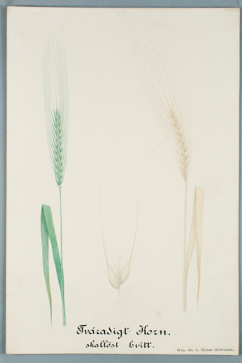 Sveriges kulturväxter. Illustration utförd av Henriette Sjöberg. Korn, tvåradigt, vitt skallöst. Odlat Ultuna 1870. A. Signerad "H.S".