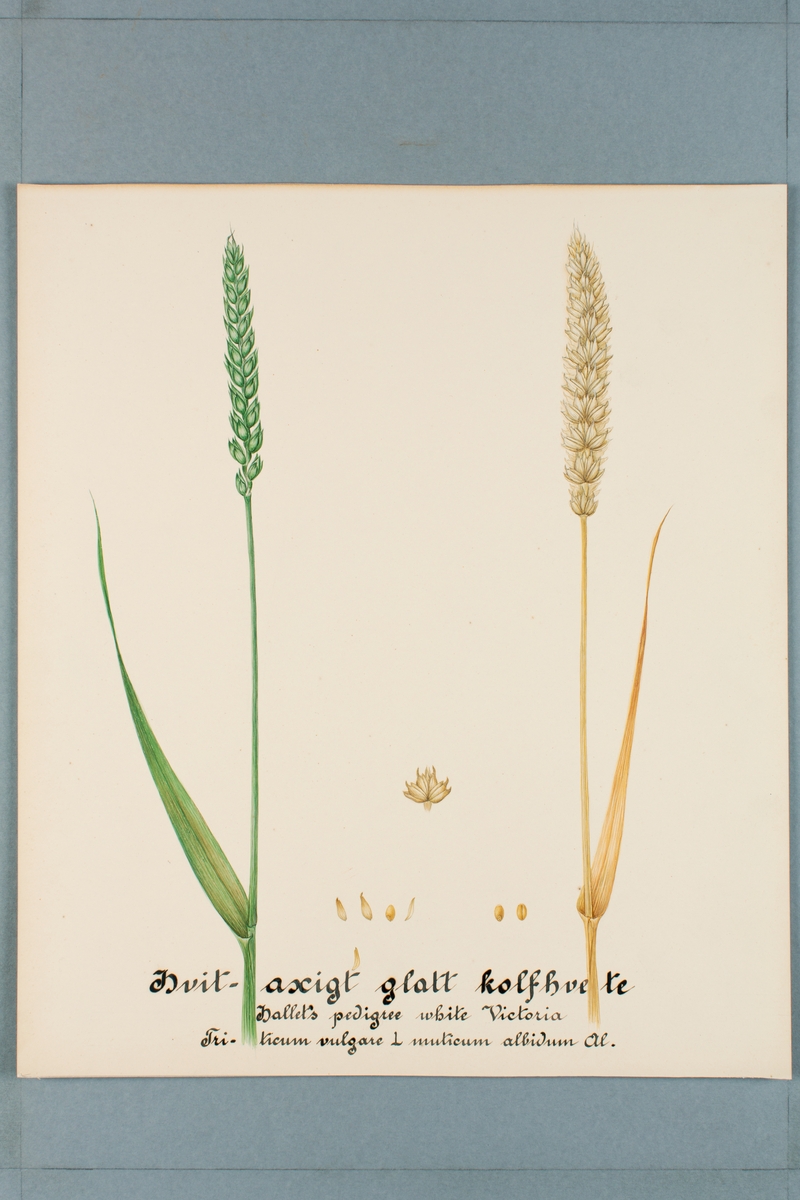 Sveriges kulturväxter. Illustration utförd av Henriette Sjöberg. Vete, vitaxigt, glatt Kolvvete. Odlingsplats och datering saknas.