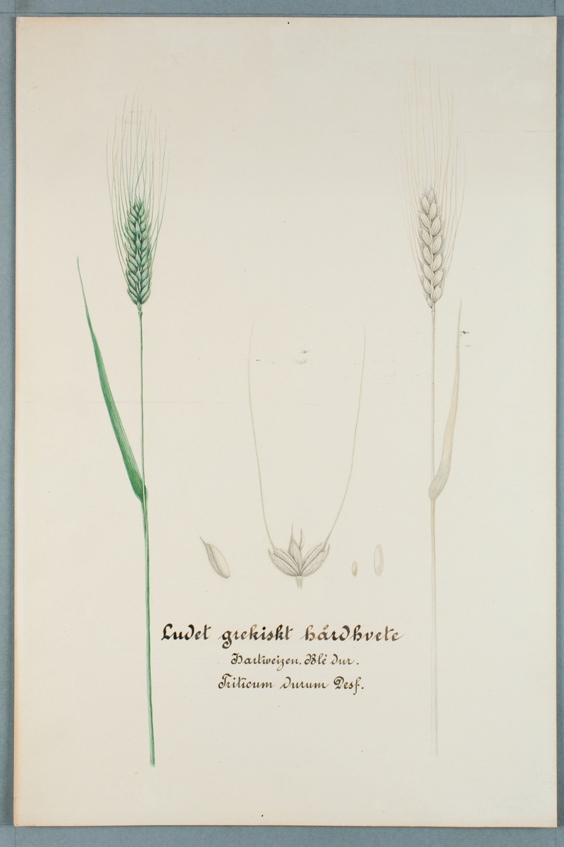 Sveriges kulturväxter. Illustration utförd av Henriette Sjöberg. Vete, ludet, grekiskt Hårdvete. Odlingsplats och datering saknas.