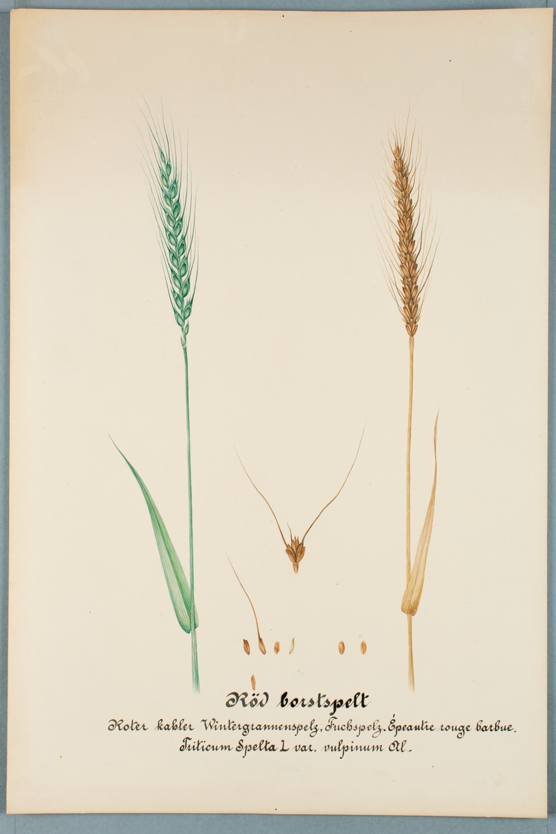 Sveriges kulturväxter. Illustration utförd av Henriette Sjöberg. Spelt, röd Borstspelt, Roter Kahler/Wintergrannenspelz/Épautre rouge barbue. Odlat Experimentalfältet 1889. Signerad "H.S. 1889. Exp".