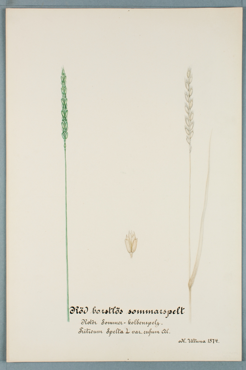 Sveriges kulturväxter. Illustration utförd av Henriette Sjöberg. Spelt, rödaxigt, borstlös sommarspelt. Odlat Ultuna 1874.