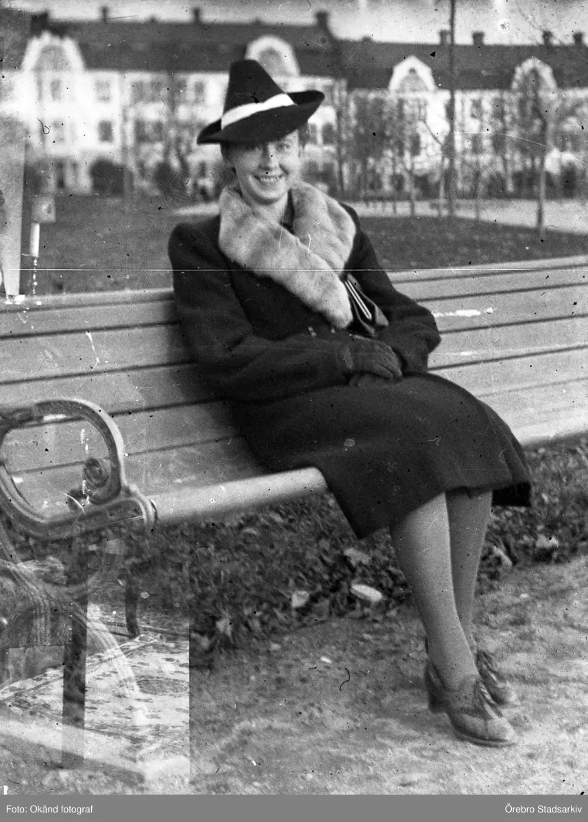 Kvinna på parkbänk vid Södra allén, 1930-tal