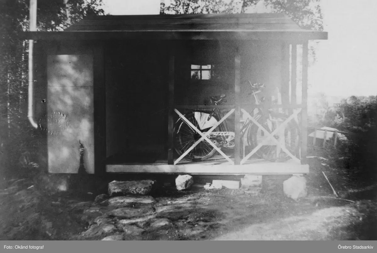 Cyklarna ställda på verandan vid sommarstuga vid Lången, 1940-tal