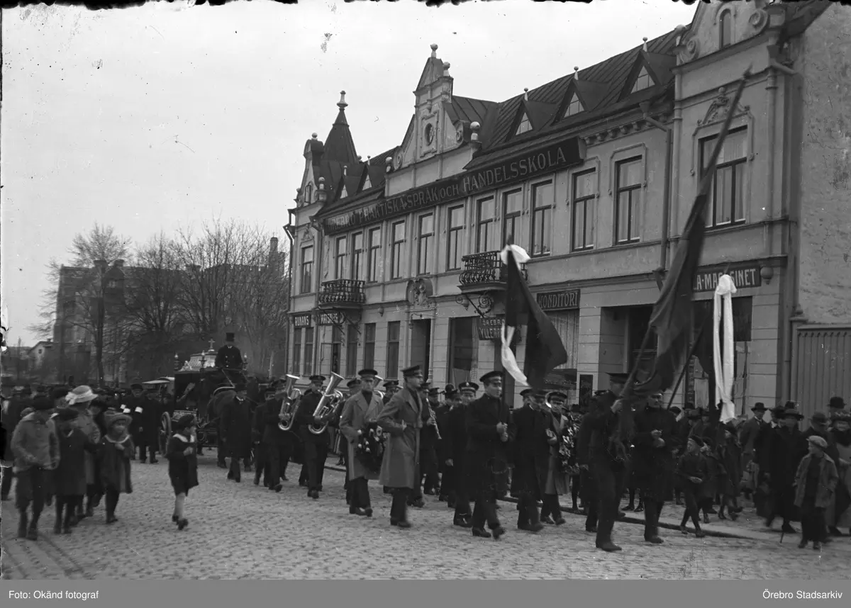 Likfärd med frälsningsarméns musikkår på Rudbecksgatan, 1930-tal