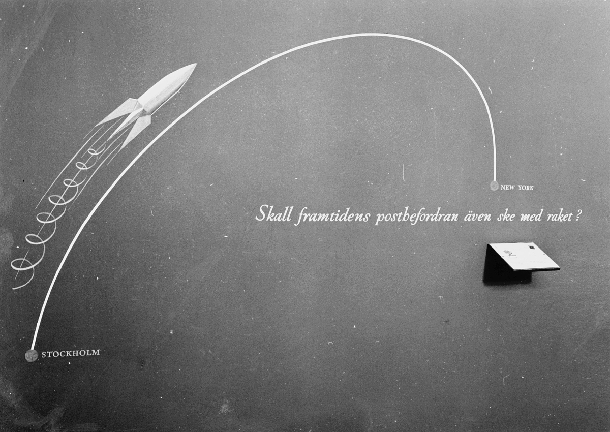 Raketpost. Illustration på vägg i Postmuseums basutställning å nedre botten.