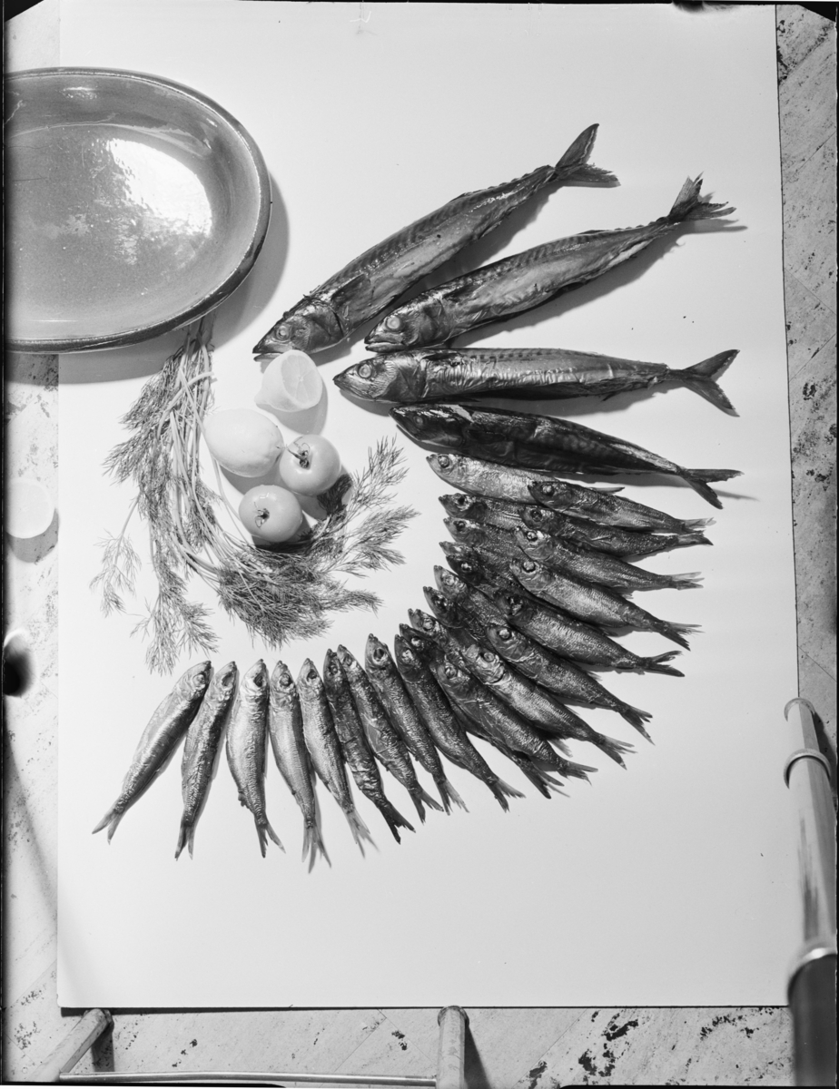 STEKSPADAR, MJÖLK OCH PILSNERGLAS (SJUKHUSSTANDARD) RÖKT MAKRILL OCH BÖCKLING
