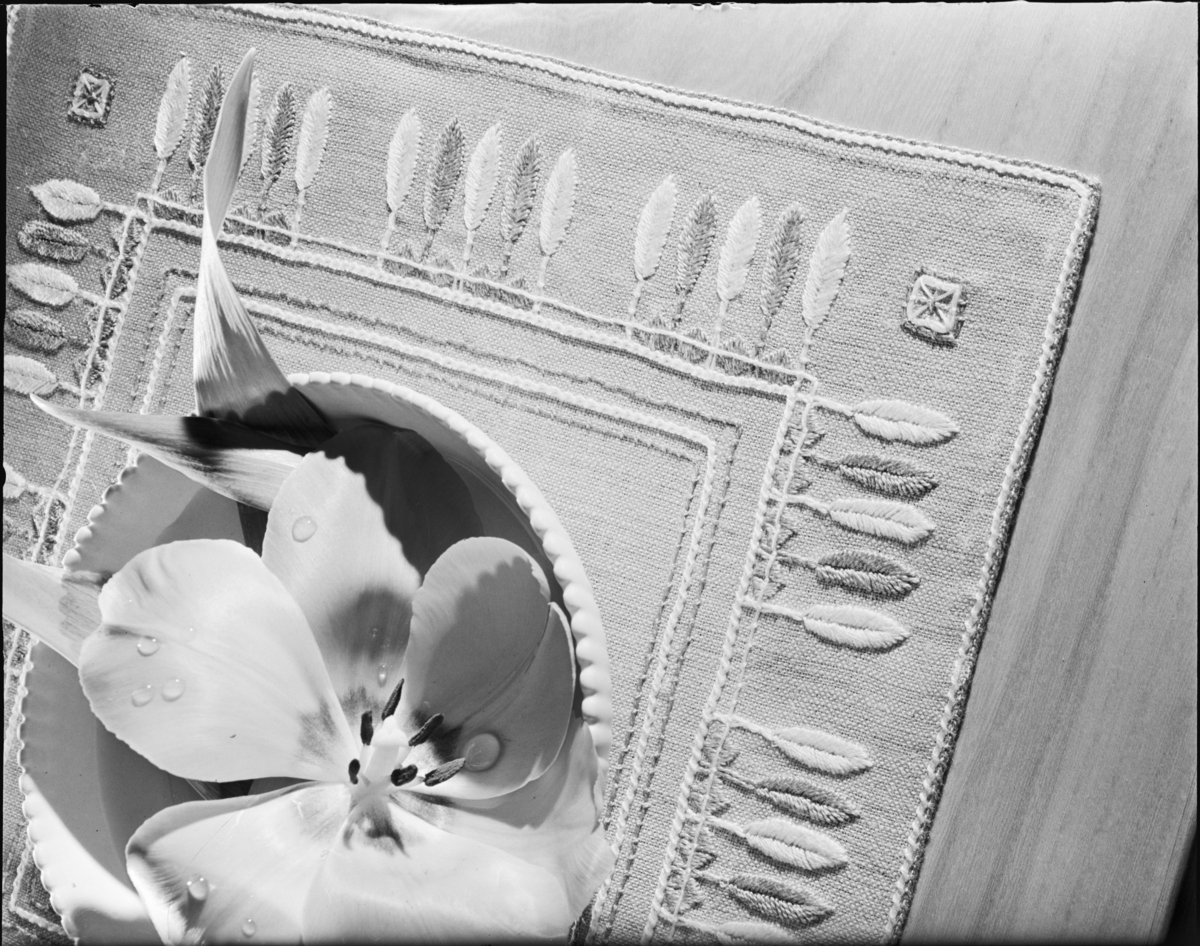 BRODERAD LJUSBLÅ DUK, VIT SKÅL, RÖD TULPAN