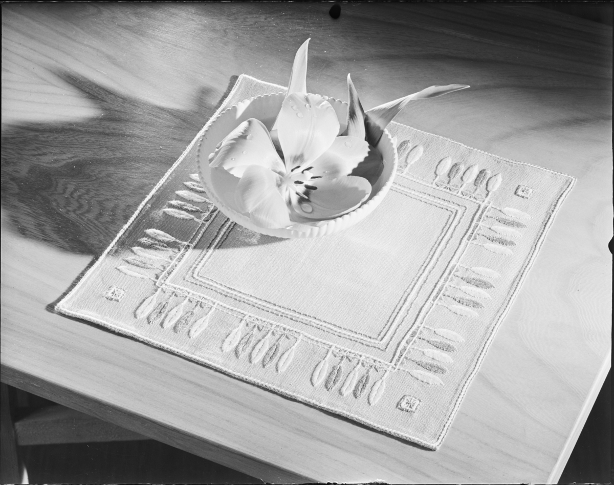 BRODERAD LJUSBLÅ DUK, VIT SKÅL, RÖD TULPAN