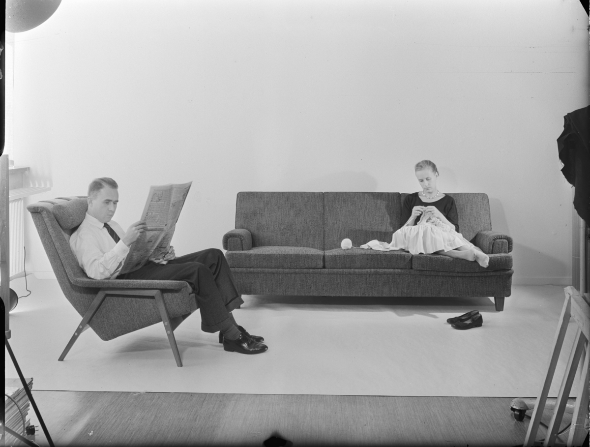 OMSLAGSBILD FÖR BROSCHYR, DUX SOFFA O. FÅTÖLJ M. MODELLER SAMT UTAN, BÄDDAD SÄNG "AVENY"