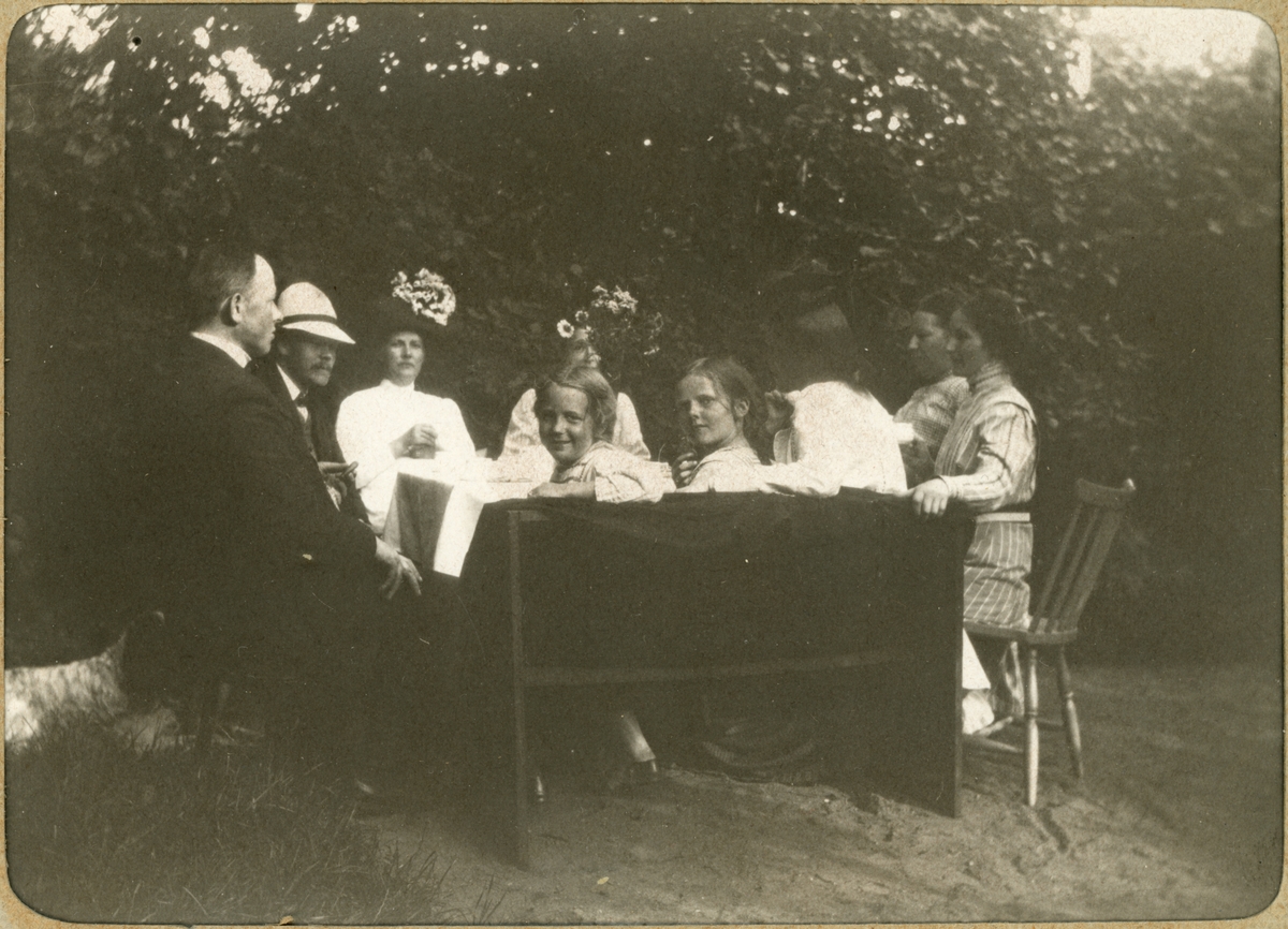 Ett sällskap sitter vid ett bord utomhus
