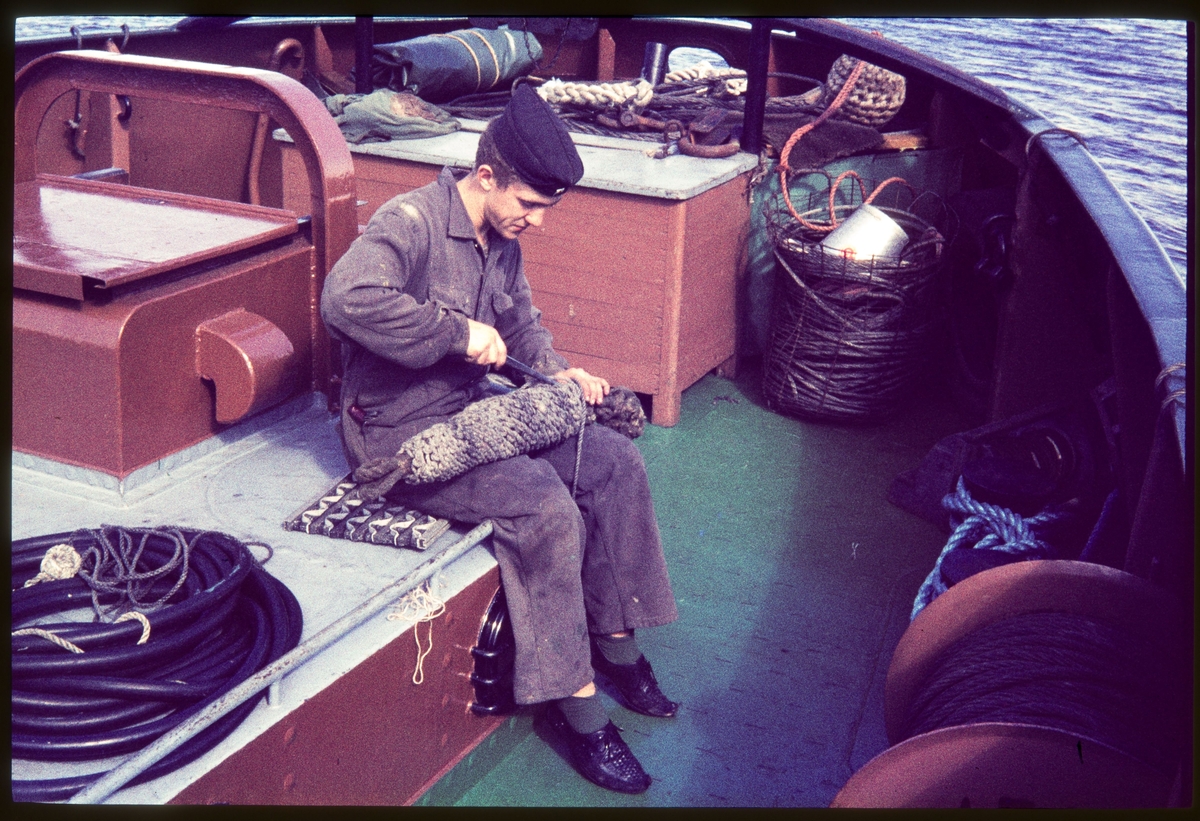 Ombord på bogserbåten Wargön. Conny Jonsson tillverkar en stävdyna till arbetsbåten Wilgot.