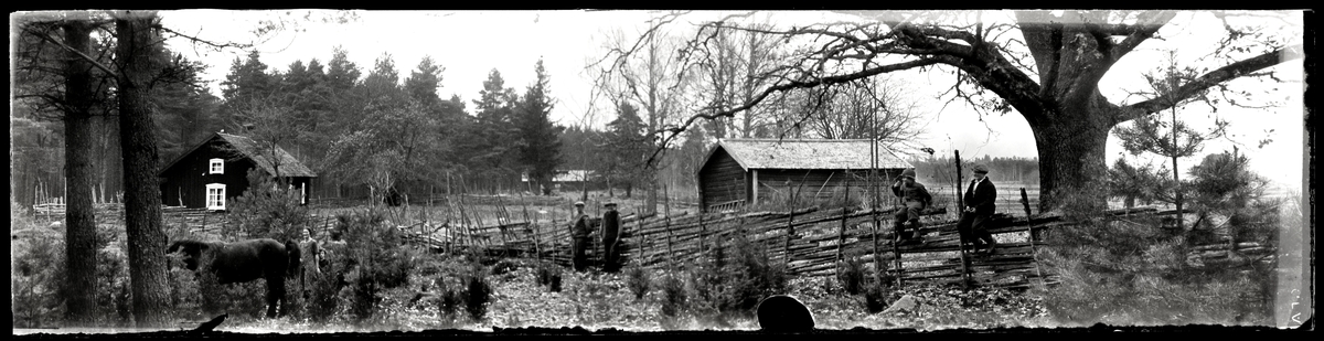 Familj framför torp med sin häst