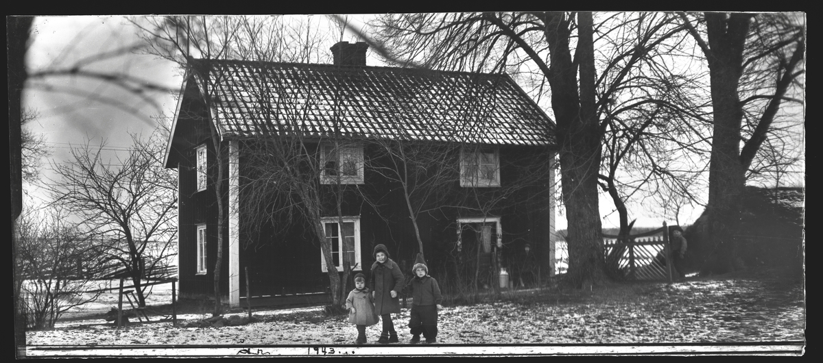 Tre barn framför hus