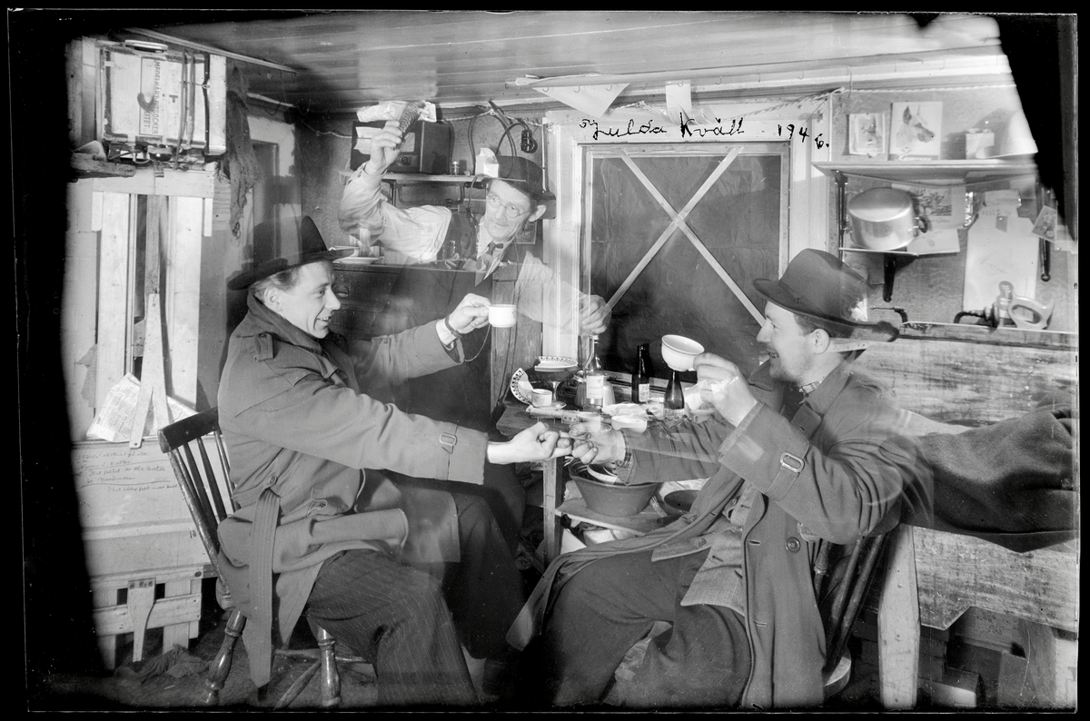 Två män drar fingerkrok över en kopp kaffe hemma hos fotografen