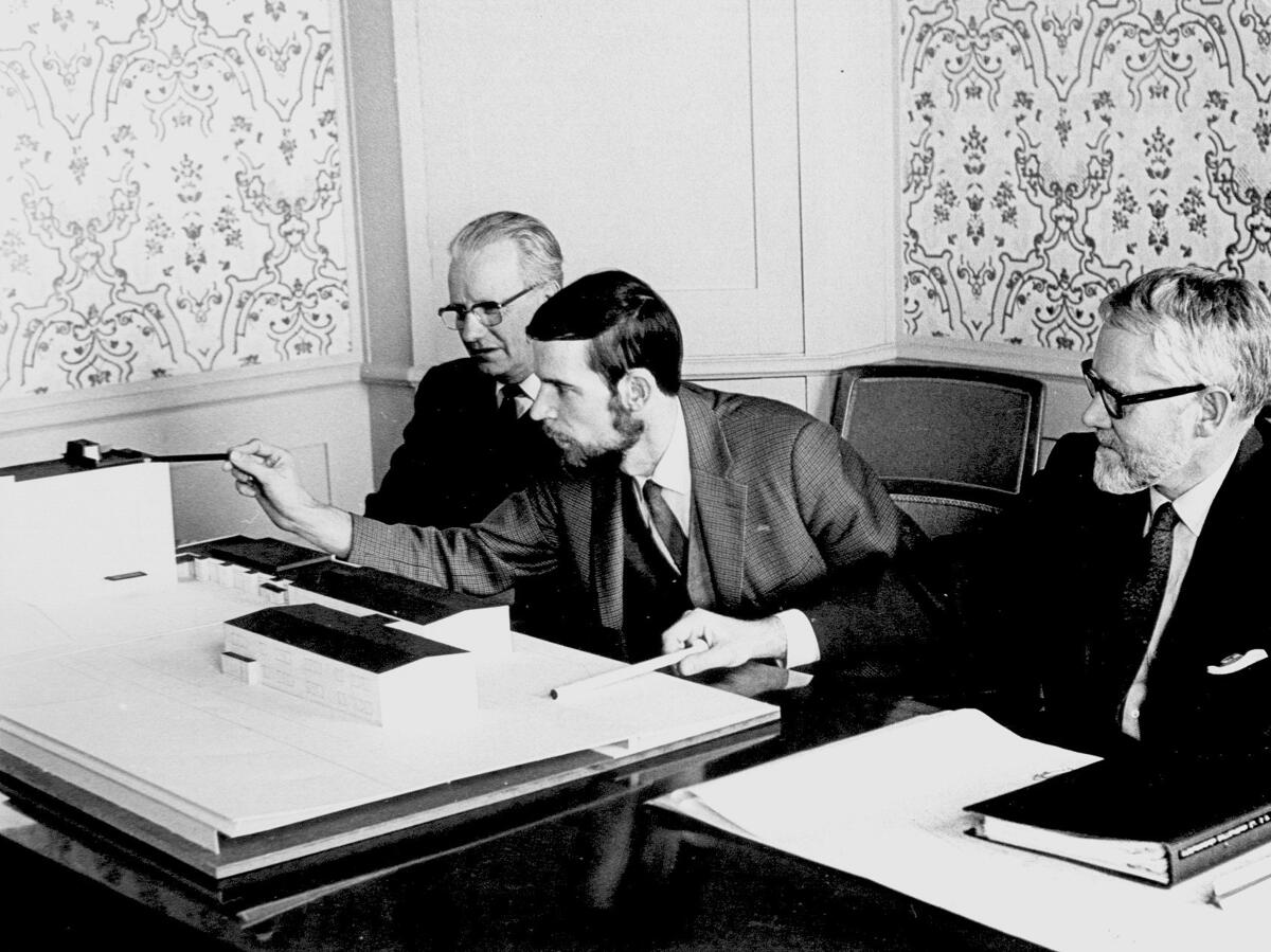 Modell av Ytterlännäsgården, etapp 2. Fr.v. Byggn.ing. Gunnar Bergkvist, Nyland, Ingenjör Andersson, Stockholm, Lekhammars arkitektkontor.