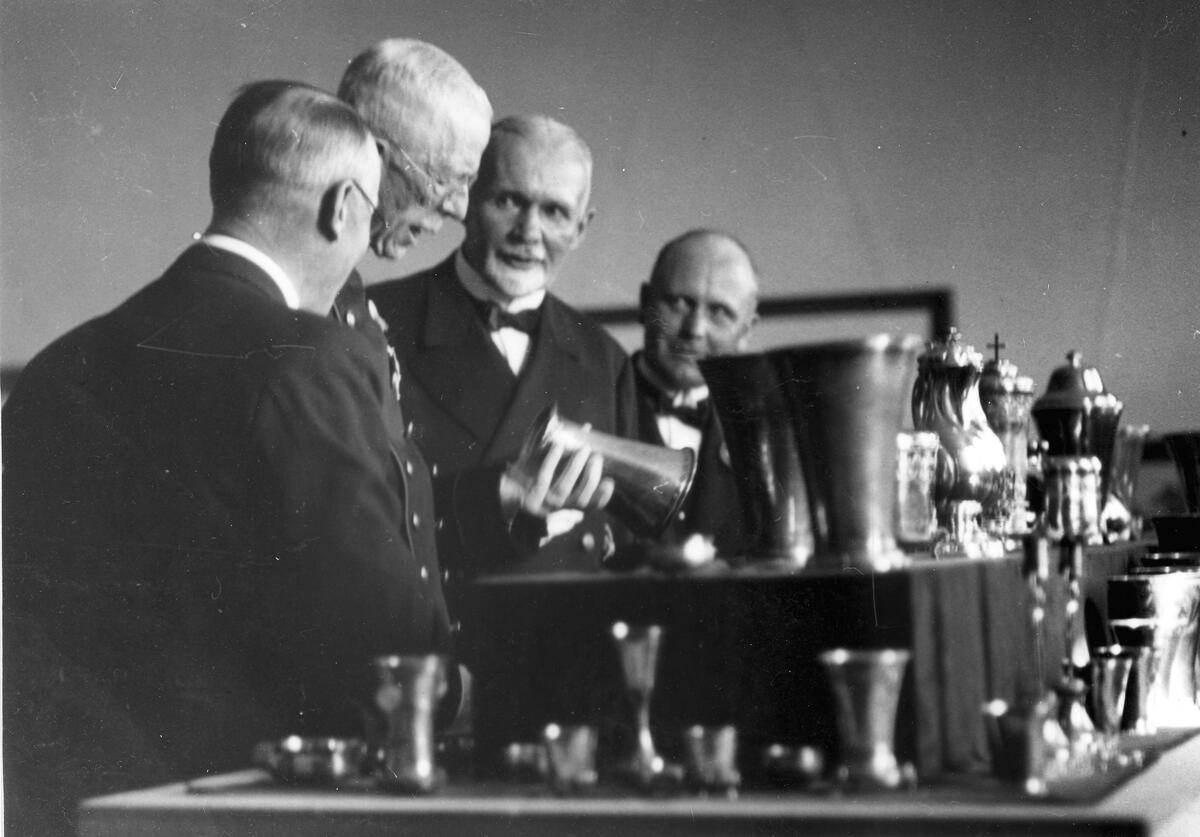 Härnösandsutställningen. Konungen ser på silverutställningen tillsammans med från höger assessor Camitz och landshövdingen.