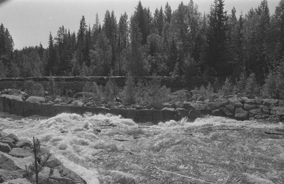 Nedanför Ramsele kraftverk. Kilstensmurar. Den lägre fungerar vid lägre vattenstånd och vid högre vattenstånd fungerar den högre bakomliggande muren