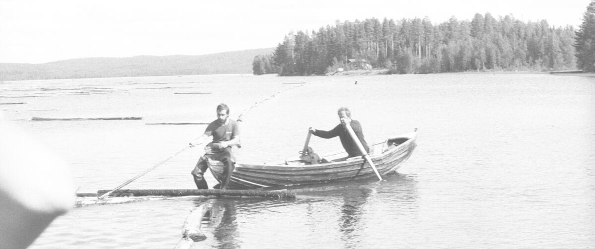 Kilströmmens nedre del. Landrensning. Stock skjuts in innanför länsen. Reidar Ragnarsson sitter på stammen och Göran Roos ror.