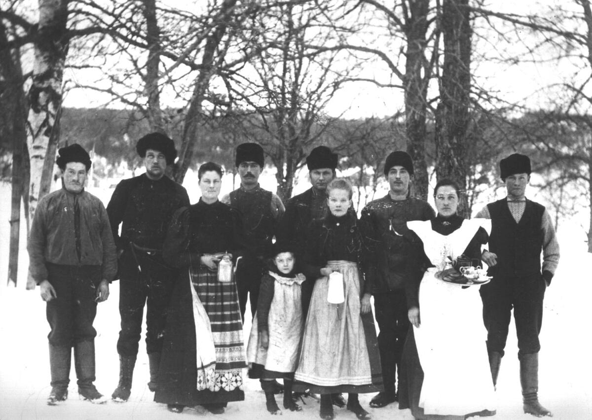 Tjänstefolk på Fantskog.; Personer: Från vänster.; 1. Jonas Nordin, dräng f. 1876 i Skog; 2. Valfrid Tengman; 3. Tekla Elisabet Tengblom, piga f. 1876 i Resele; 4. Erik Bohlin; 5. Hilda Marareta Tjernberg, f 1892 i Resele; 6. Erik Hjalmar Tjernberg; 7. Ida Helena Tjernberg, f. 1885 i Resele; 8. Otto Bolin; 9. Maria Hansson; 10. Reinhold Nyberg, dräng f. 1881 i Ullånger; Byggnaden "Fantskog" , ligger i byn som också heter Fantskog.