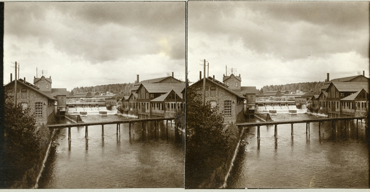 Stereoskopi. Gamla turbinhuset och Mekanisk verkstad vid Fagersta bruk, 1909.