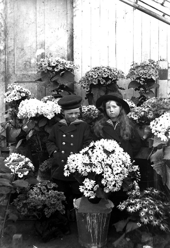 Två barn, flicka och pojke klädda i sjömansdräkter i blomhavet i ett växthus.