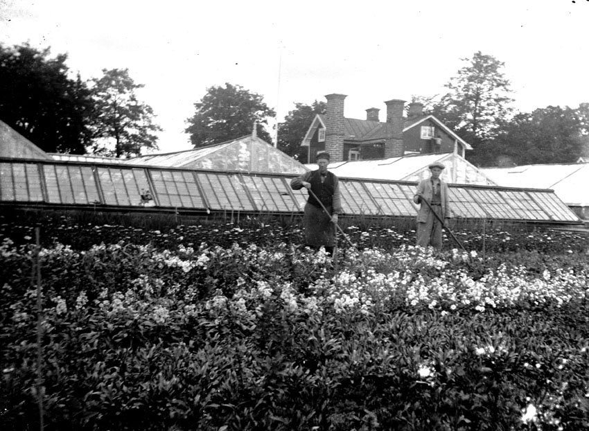 Två trädgårdsarbetare bland blommorna utanför ett växthus.