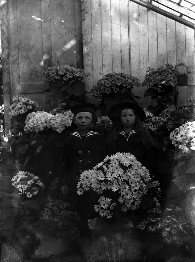 Grupporträtt av två barn klädda i sjömansdräkter bland blommorna i ett växthus.