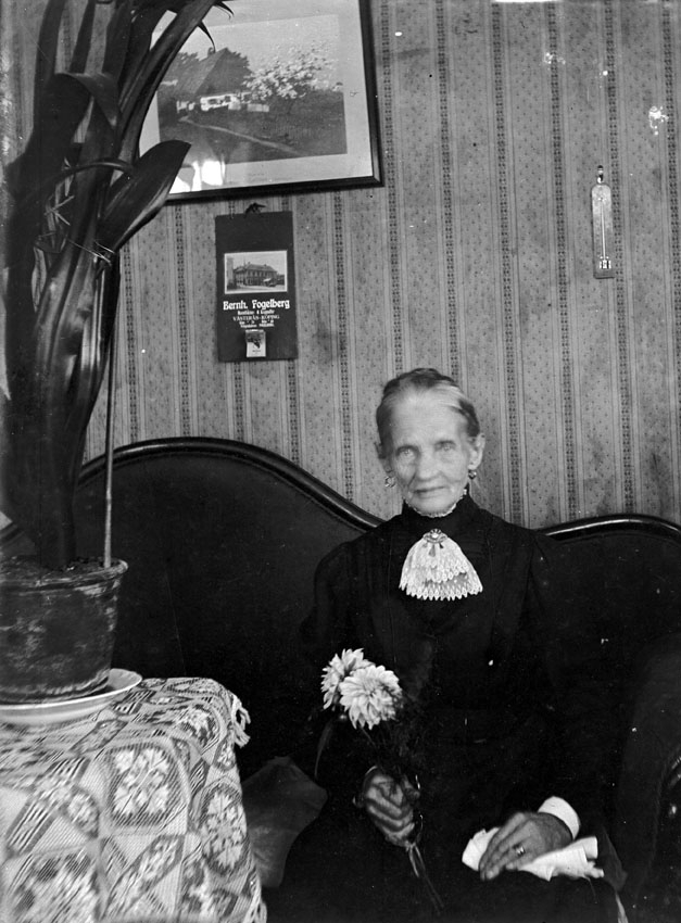 Äldre kvinna sitter i soffan med en blomma i handen.