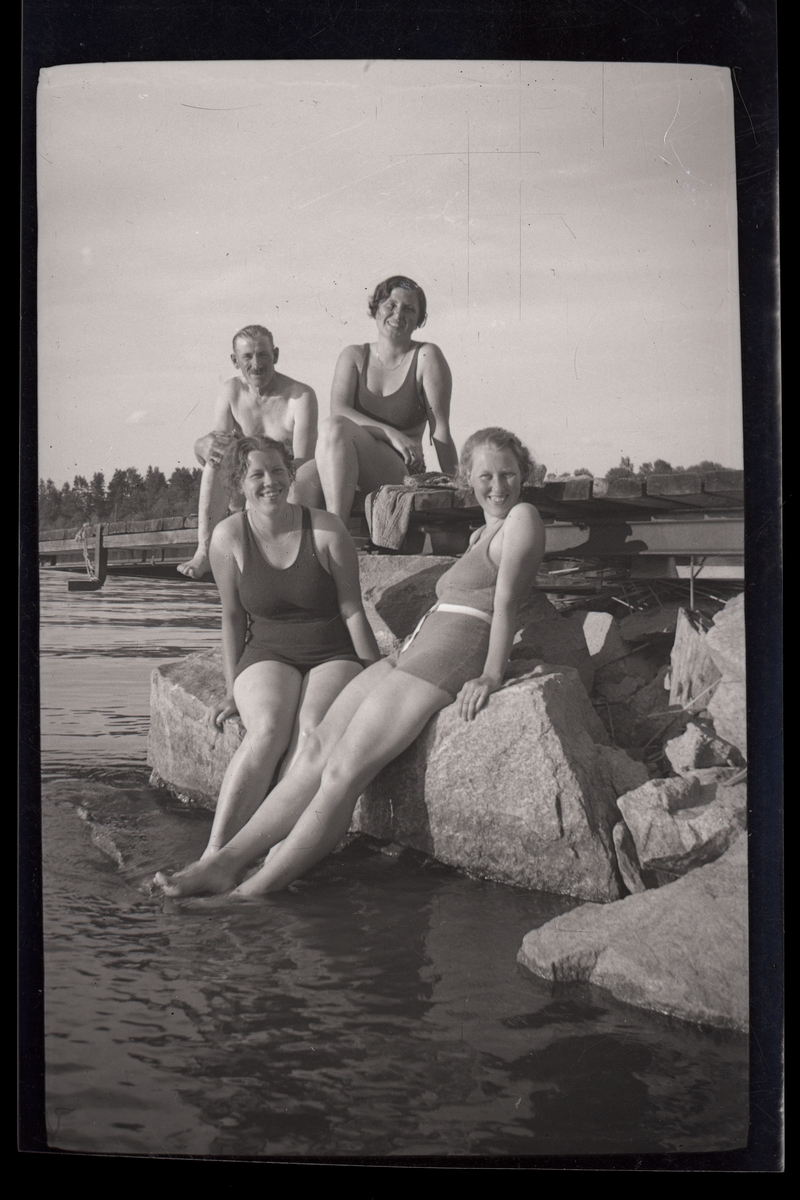 Tre kvinnor och en man på en badstrand.
