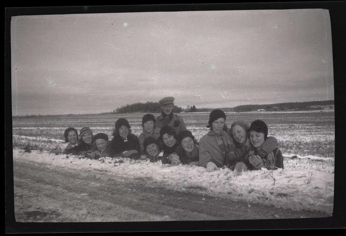 Ett gäng glada ungdomar tittar upp ur ett vägdike.
