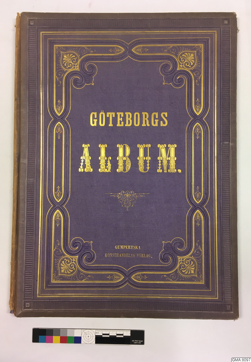 "Göteborgs Album." Samlingspärm - med citatsrubrik i guldtryck - innehållande 12 st. göteborgsvyer, fotografier från 1869 (?), tagna av "Göteborgs Musei Fotogr. Atelier".
