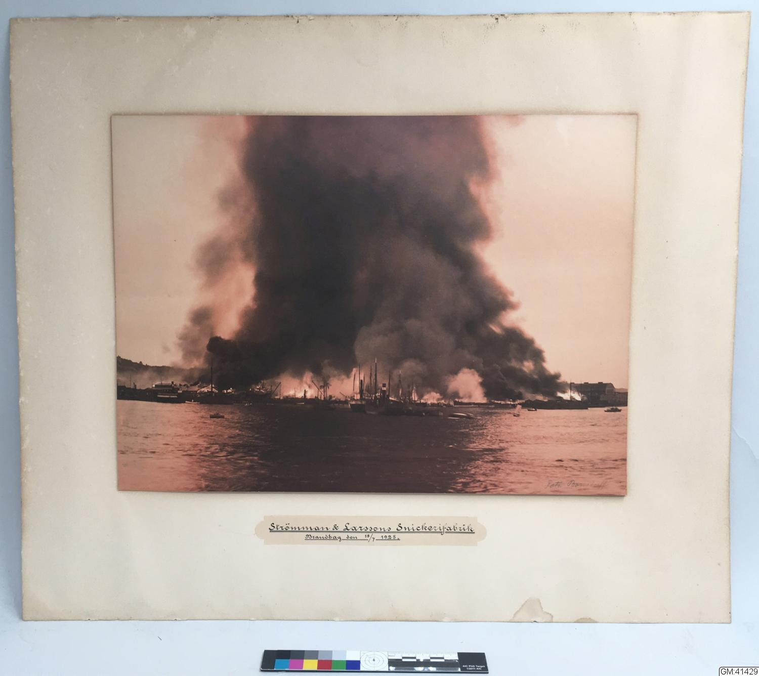 Fotot är taget den 18 juli 1925 och visar branden i det göteborgska fabriksområdet.