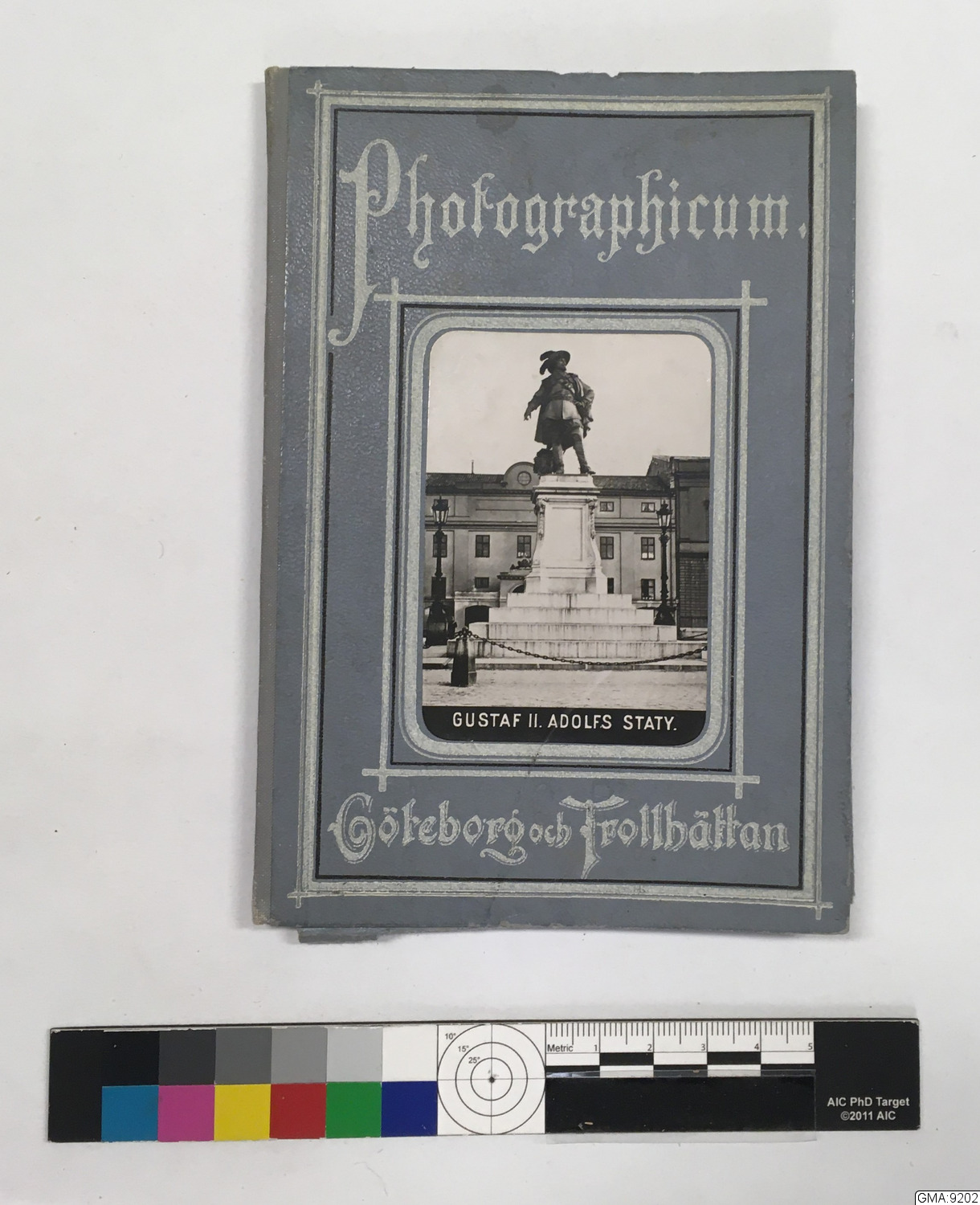 "Photographicum", 10 st. fotografiska vykort - Göteborg 7st., Trollhättan 3 st. - i omslag av kartong med citerad rubrik. På pärmen foto av Gustav II Adolfsstatyn, Göteborg. Liten 8:o.