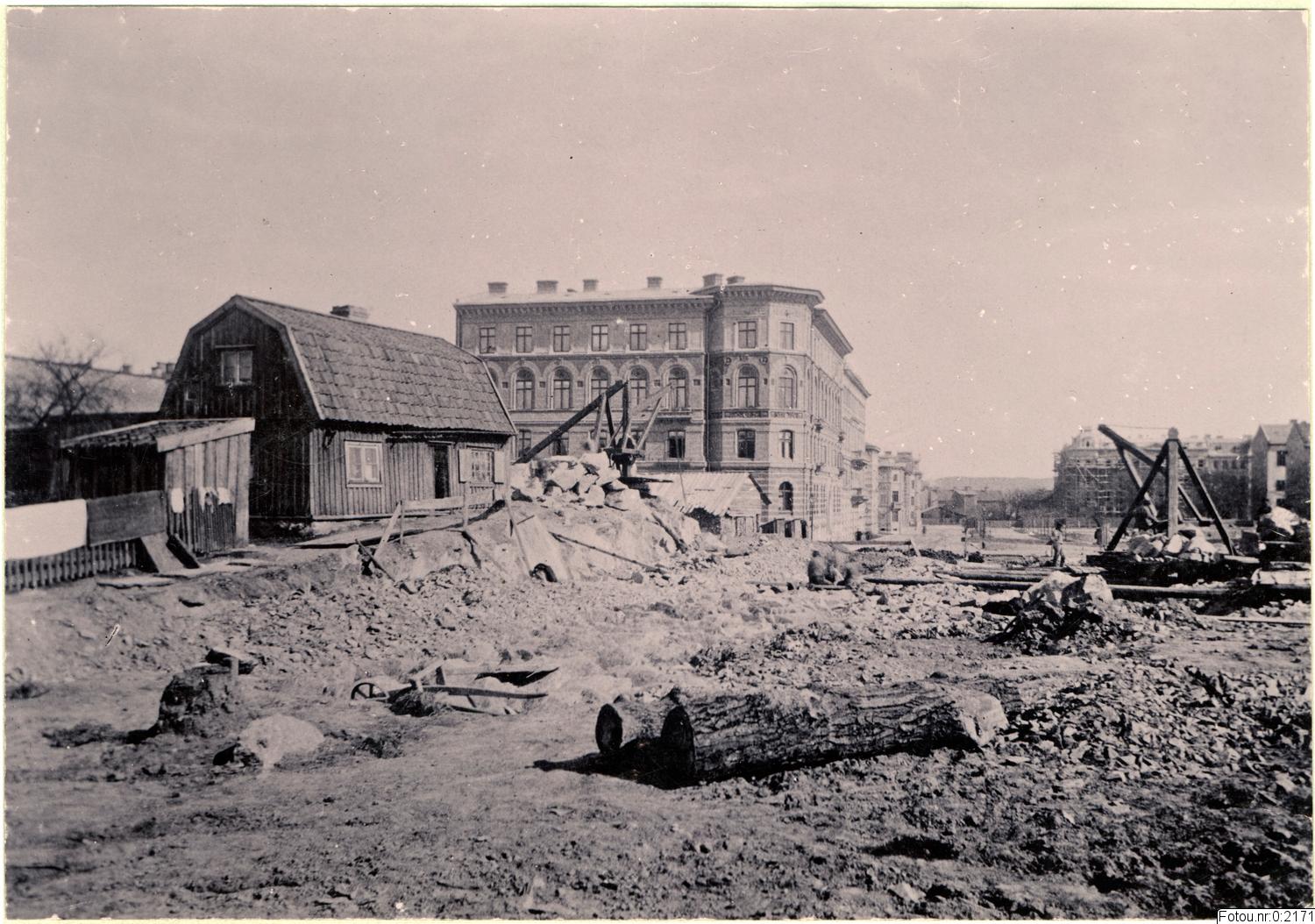 Den sista kåken i Flygarns Haga, det område som blev Vasastaden, blick mot öster. I bakgrunden Vasagatan och Götabergsgatan.